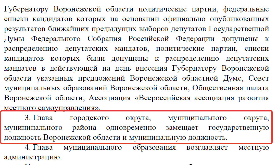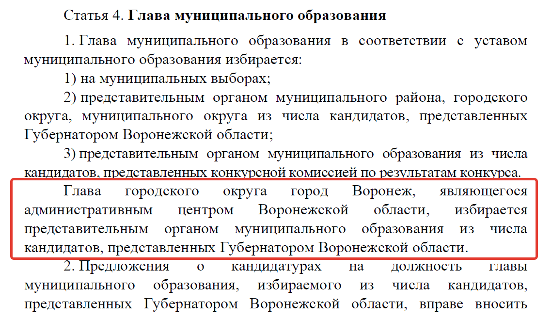 Стоит добавить, что новые правила избрания главы областного центра приводят региональное законодательство в соответствие с новым федеральным законом «Об общих принципах организации МСУ в единой системе публичной власти». Этот федеральный закон, вступающий в силу 19 июня, обязывает все столицы субъектов РФ, включая Воронеж, избирать глав городов по новой единой процедуре: из числа кандидатов, предложенных главой региона.