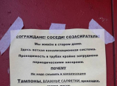 «Мы живем в старом доме. Здесь ветхая канализационная система. Проходимость в трубах крайне затруднена периодическими засорами. В унитаз только говно! Вместе мы победим фекалии!» – гласит послание.