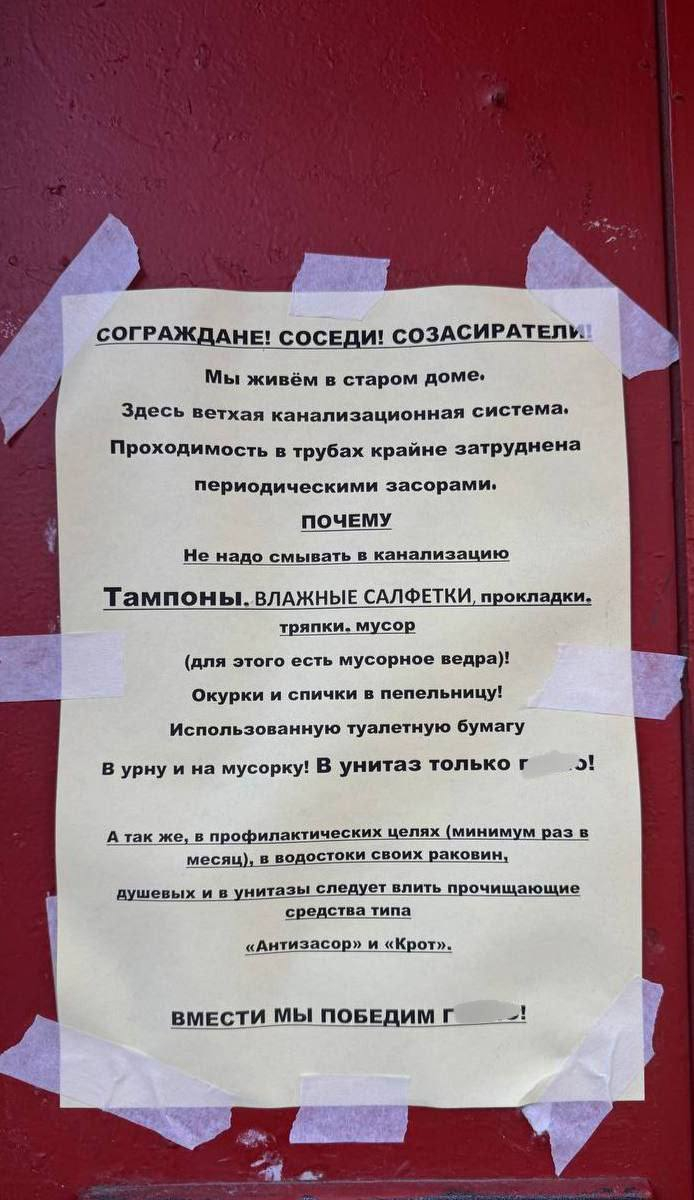 Его автор решил напрямую обратиться к соседям, которые, по всей видимости, регулярно засоряют канализацию.