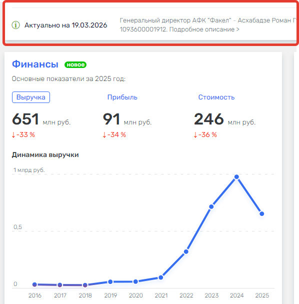 Ассоциация футбольный клуб «Факел» раскрыла свои основные финансовые показатели за 2025 год: все они ушли в минус. Выручка АФК «Факел» сократилась на 33 процента, с 975 млн в позапрошлом году до 651 млн рублей – в прошлом, а чистая прибыль уменьшилась на 34 процента.