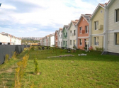 На территории поселка 225 таунхаусов разной планировки с внутренним двором и площадкой для парковки двух автомобилей на каждый дом.