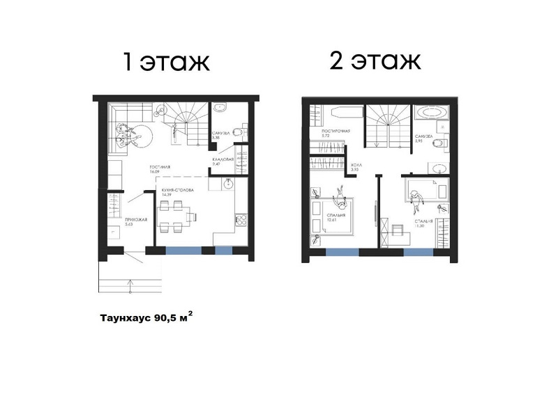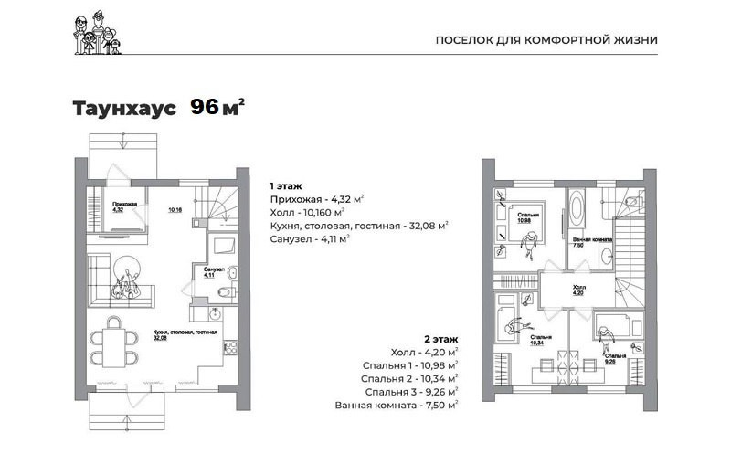 Их три — площадью 90,5 кв. метра, 96 кв. метра и 114,5 кв. метра. На первом этаже расположена просторная кухня, объединенная с обеденной зоной и гостиной, которая станет центральным местом для семейных ужинов и дружеских встреч. Для вашего удобства на 1 этаже также находится туалетная комната и прачечная.
