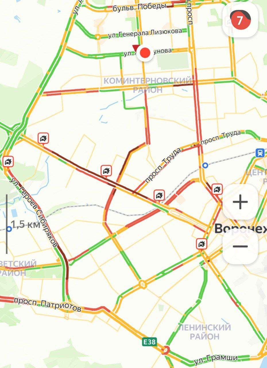 Как видно на карте, тяжелее всего приходится воронежцам в центре города, на улице 9 Января и на юго-западе. Там магистрали окрасились в красный цвет, а местами и вовсе в бордовый.