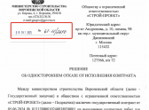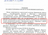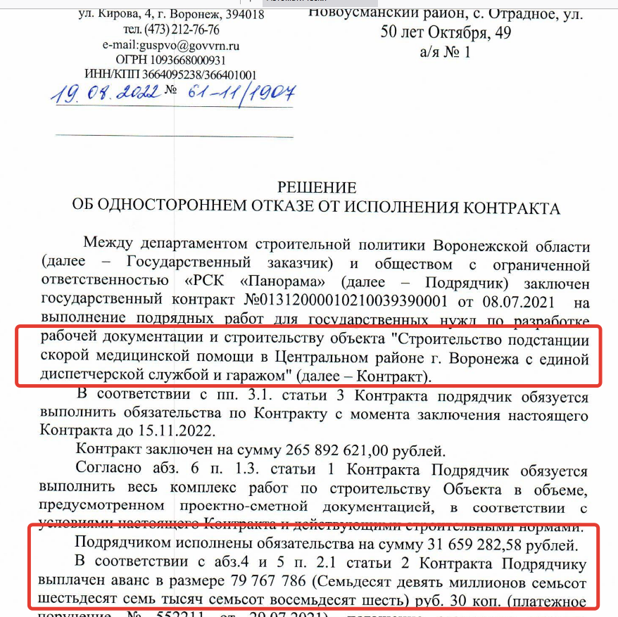 скриншот документа от августа 2022 года, заказчик, Департамент строительной политики Воронежской области, разрывает контракта с первым подрядчиком