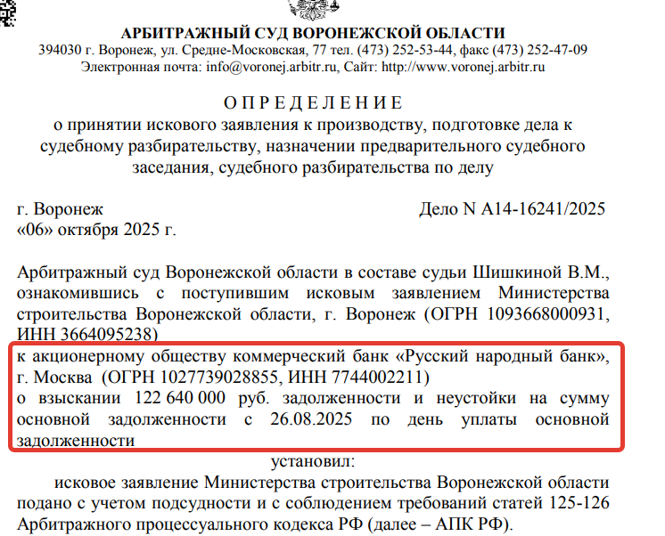 В свою очередь провинциальный минстрой в прошлом октябре подал иск в Арбитражный суд о взыскании задолженности и неустойки – 122,6 млн рублей – на коммерческий банк «Русский народный банк». Эта сумма полностью (до копейки, 122 млн 640 тыс рублей) совпадает с размером аванса, перечисленного московскому подрядчику в июне 2024 года.