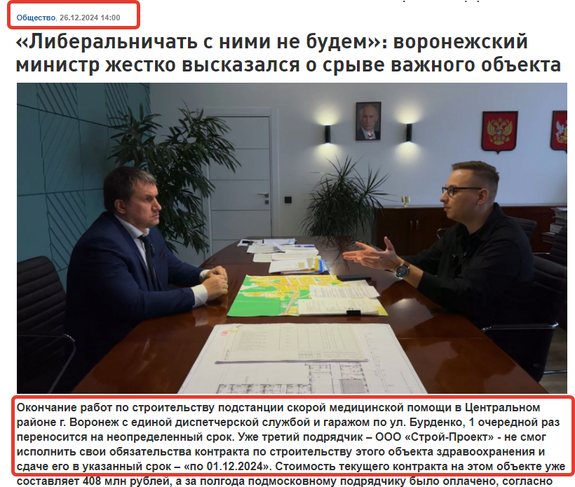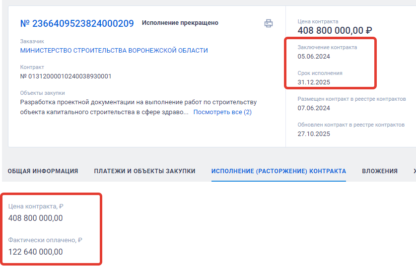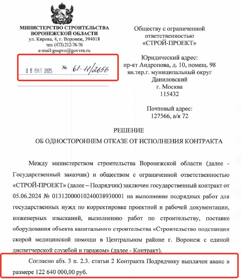 Тем не менее, эта организация еще летом 2024 года получила от заказчика, Минстроя, в рамках исполнения контракта на 408 млн рублей аванс - 122,6 млн рублей. Это деньги бюджета Воронежской области, они реально были потрачены вот уже как полтора года назад, но не известно, на что.