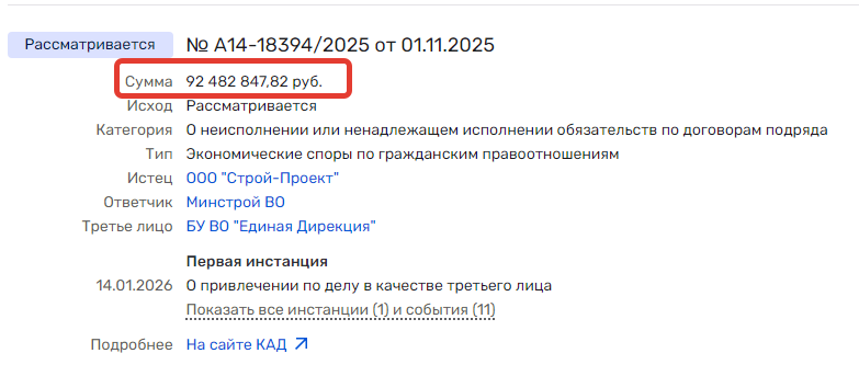 Вероятно, эти деньги - независимая банковская гарантия по госконтракту, который был в одностороннем порядке (от Минстроя) прекращен, а потому заказчик хочет вернуть эти средства. К делу привлечены в качестве третьих лиц ООО «Строй-Проект» и воронежское БУ «Единая дирекция капитального строительства». Это также указывает, что иск касается именно истории со строительством в Воронеже станции скорой медицинской помощи на ул. Бурденко, 1.