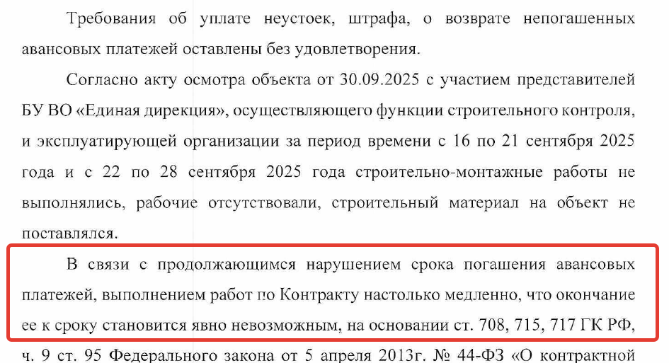 скриншот из документа провинциального минстроя, он утверждает, что на объекте неделями отсутствовали рабочие, материалы на объект не поставлялись, хотя приличный аванс (30% от общей цены контракта) был выплачен подрядчику еще год назад