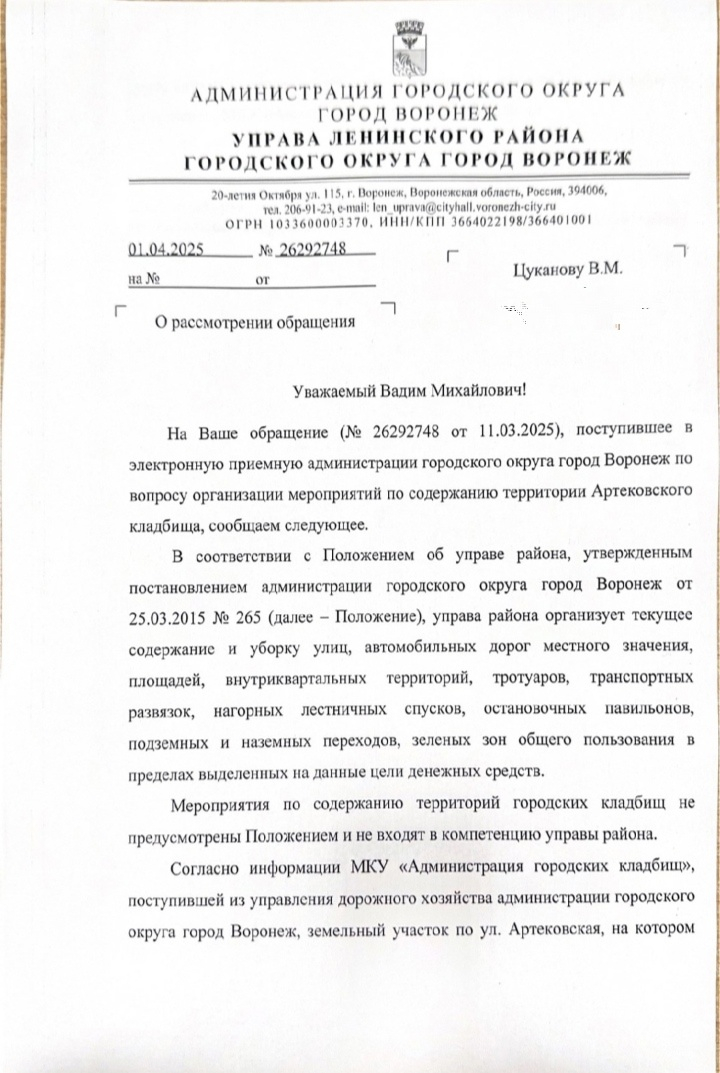 «Территорию кладбища на улице Артековской управа Ленинского района не убирает из-за того, что там кладбище, а значит они тут ни при чем, не в их компетенции, управление дорожного хозяйства Воронежа не следит, потому что земля не передана в постоянное (бессрочное) пользование МКУ «Администрация городских кладбищ».