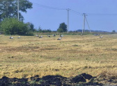 На фотографии видно просторное поле, видимо, после уборки урожая, над которым протянулись линии электропередач. Посреди золотистой стерни спокойно расхаживают аисты — около десятка больших белых птиц с характерным черным оперением на крыльях.