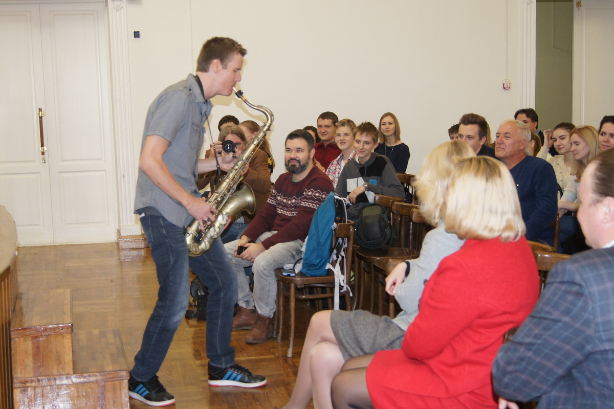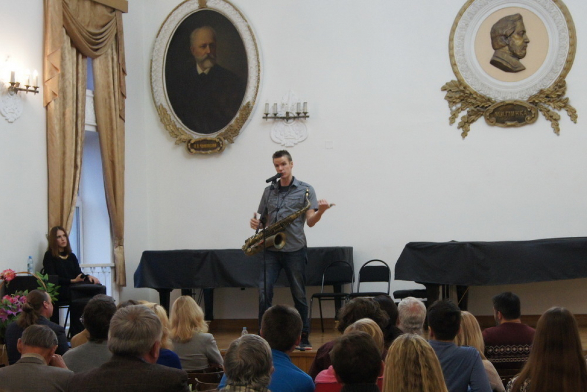 Американский исполнитель джаза, известный своим необычным проектом BEATBoX SAX, выступил в концертном зале Воронежского музыкального колледжа имени Ростроповичей, где дал мастер-класс студентам.