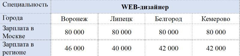Так, воронежские web-дизайнеры получают в среднем 46 тыс. рублей в месяц, тогда как москвичи зарабатывают около 80 тыс. рублей. Липецкие специалисты в среднем зарабатывают 40 тыс. рублей, белгородские — 42 тыс. рублей в месяц. Не слишком далеко от городов Черноземья ушел город Кемерово: здесь web-дизайнеры в месяц получают около 42 тыс. рублей.