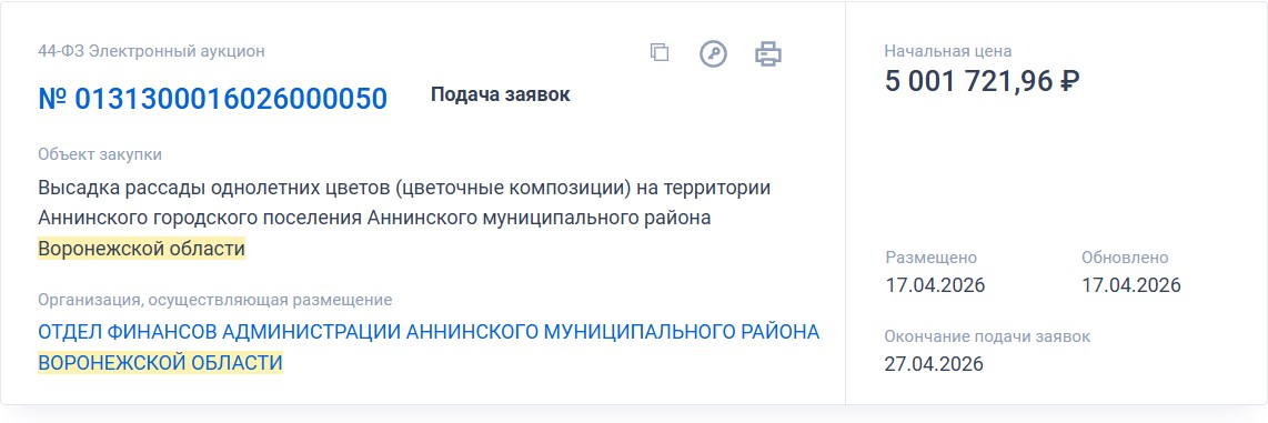 Только-только областной центр подвел итоги тендера на выполнение работ по посадке цветов в клумбы рядом с административными зданиями по адресам: пл. Ленина, 1, ул. Таранченко, д.34 и в Кольцовском сквере, как свой - похожий, но более масштабный - объявили в Анне: «царстве» Василия Авдеева.