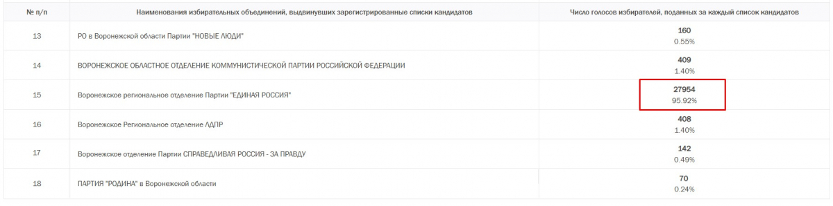Отметим, что в том числе благодаря такой масштабной поддержке, которую аннинцы оказали партии власти, «Единая Россия» забирает большую часть мандатов в Воронежской областной Думе — 51 из 56.