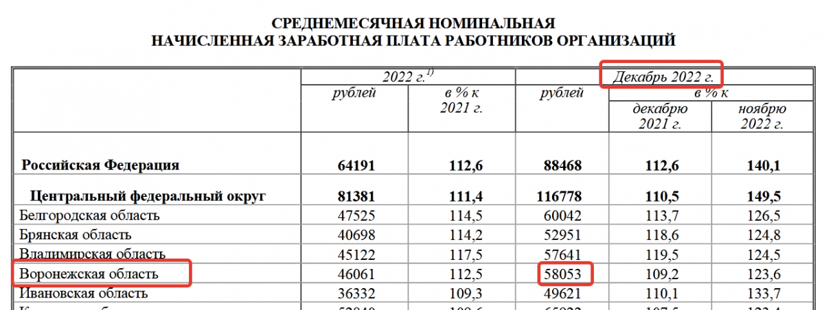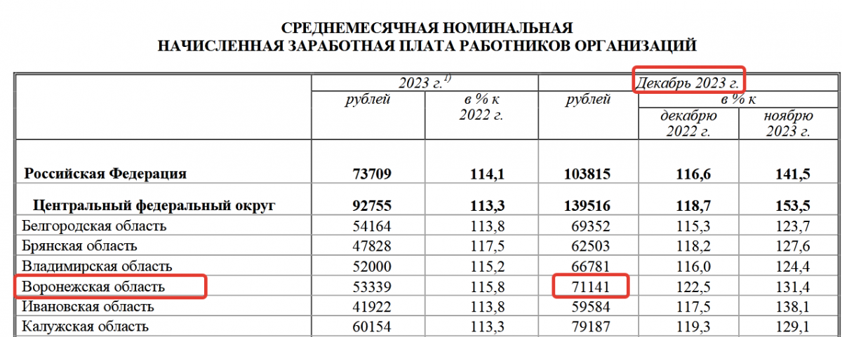 Из него видно, что декабрьский скачок по размеру зарплаты носил временный характер, в целом за 2023 год среднемесячная зарплата у воронежцев была значительно меньше – 53 тысячи 339 рублей в месяц. А декабрьское повышение может объясняться массовой выплатой сотрудникам премий по итогам года и иных денежных поощрений к Новому году.