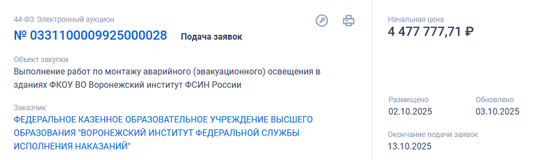 В системе госзакупок появился тендер на выполнение работ по монтажу аварийного эвакуационного освещения в зданиях Воронежского института ФСИН России. Торги начинаются с 4 миллионов 447 тысяч рублей, заказчиком выступает сам вуз.
