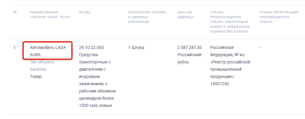 Контракт с неназванным победителем торгов был заключен 13 марта. В общей информации о договоре сообщается, что речь идет о приобретении автомобиля LADA AURA. Его цена – 2 млн 87 тысяч рублей.