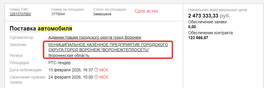 скриншот сайта госзакупок, из карточки контракта МКП "Воронежтеплосеть"