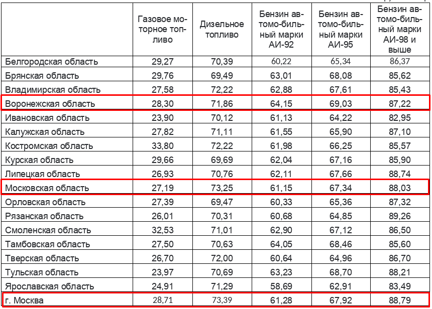 Итак, средняя стоимость литра газового моторного топлива в октябре в Воронежской области составляла 28 руб 30 коп, тем временем в Москве – 28 руб 71 коп. Дизельное топливо в нашем регионе тоже было дешевле, чем в столице – 71 руб 86 коп и 73 руб 39 коп соответственно. Существенной разница была и с ценами на марки АИ-98 и выше – 87 руб 22 коп в Воронежской области и 88 руб 79 коп в Москве.