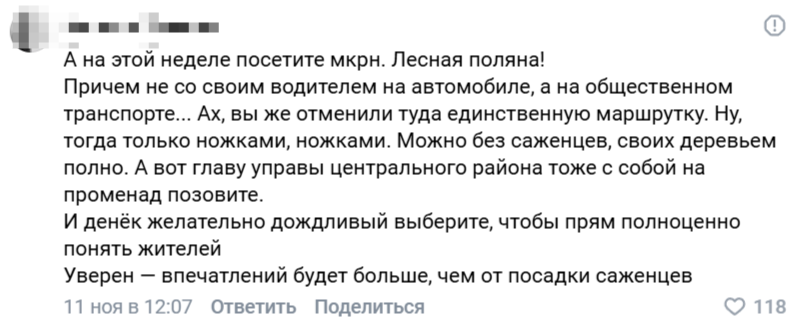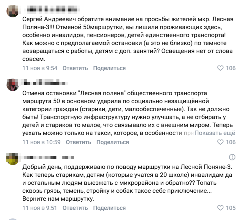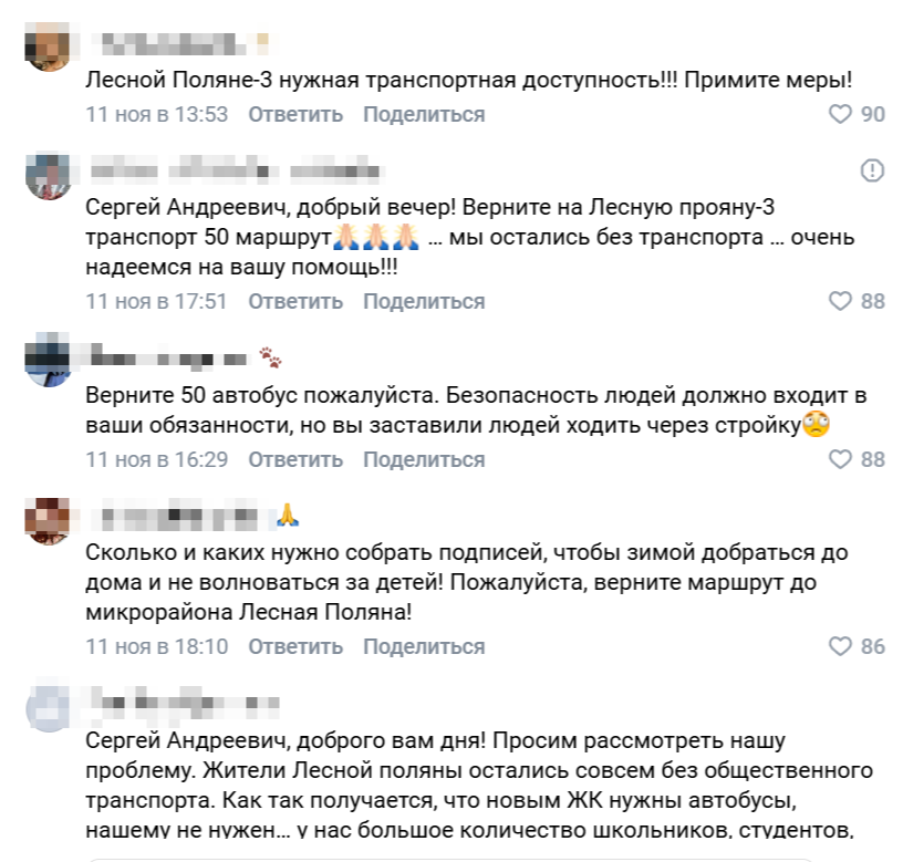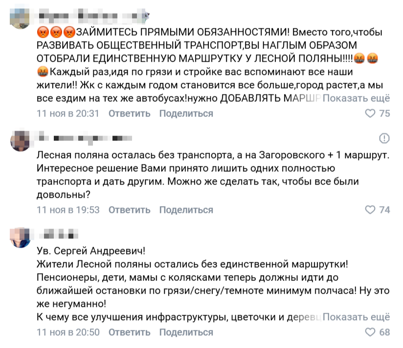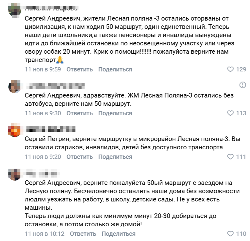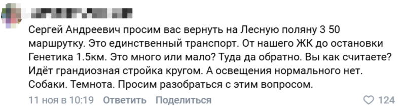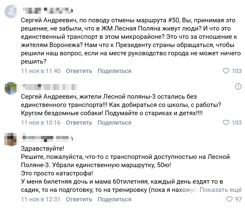 «Сергей Андреевич, верните пожалуйста 50ый маршрут с заездом на Лесную поляну. Бесчеловечно оставлять наши дома без возможности людям уезжать на работу, в школу, детские сады. Не у всех есть машины. Теперь люди должны как минимум минут 20-30 добираться до остановки, а потом столько же домой», - недоумевают воронежцы.