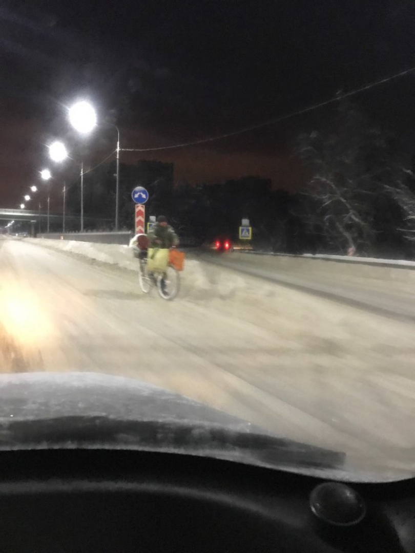 Безумного велосипедиста сфотографировали на заснеженной трассе в Воронеже