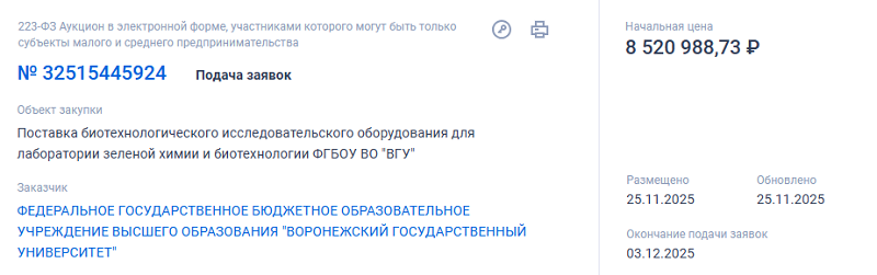 В системе госзакупок появился тендер на поставку исследовательского оборудования в лабораторию зеленой химии и биотехнологии ВГУ. Торги стартуют с отметки в 8,5 млн рублей, возможно, университету удастся сторговаться с подрядчиками на подешевле.