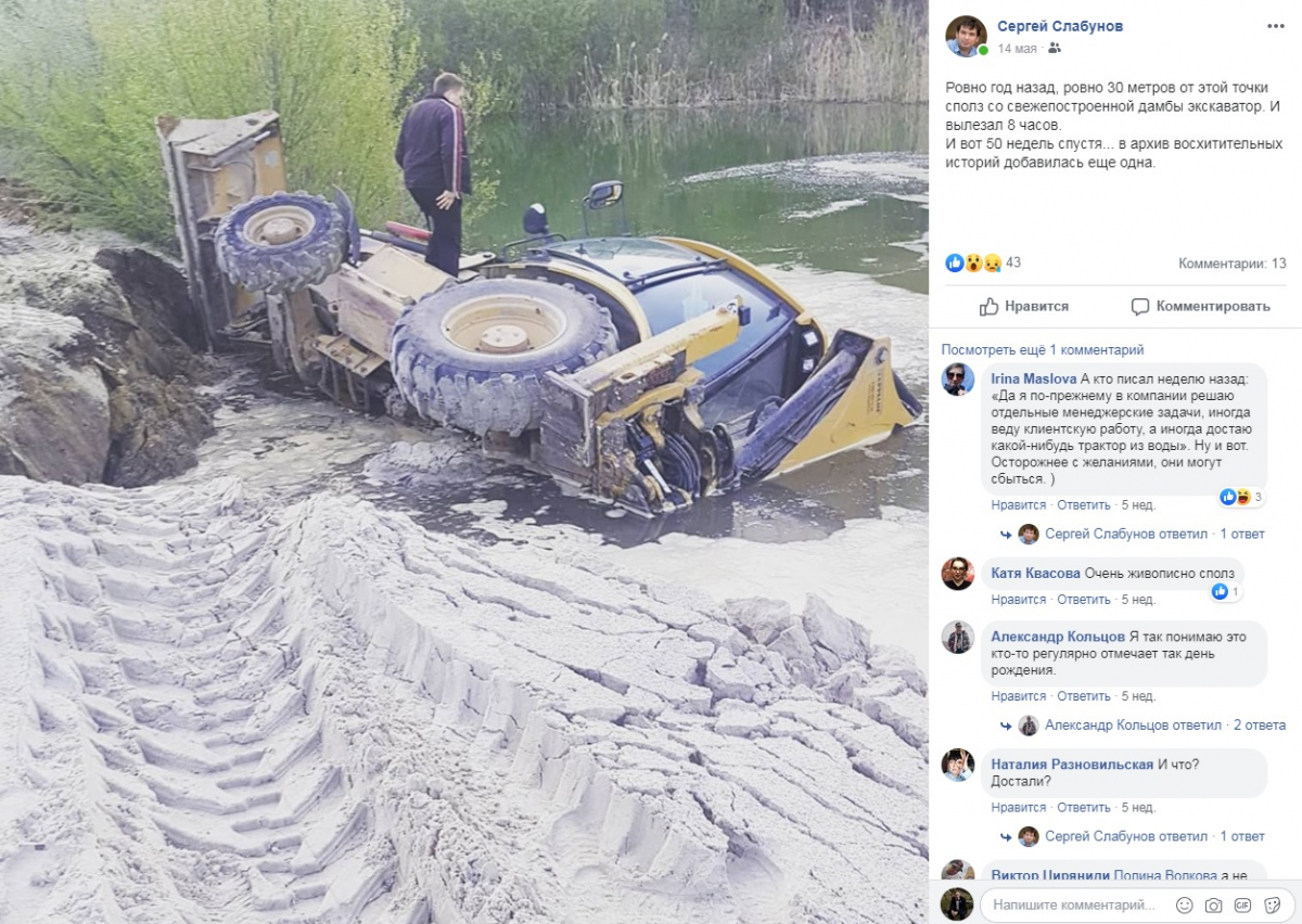 Вот он приглашает воронежцев на свои мероприятия, но при этом в кадре стоит с лопатой. Ранее в соцсетях Слабунов также появлялся на площадке El Evento, где тонул трактор, похожая история была и в прошлом году.