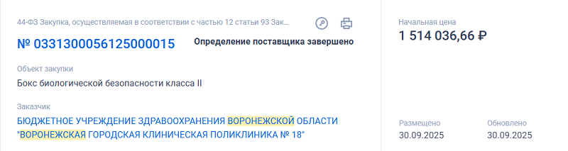 В системе госзакупок появился тендер на поставку бокса биологической безопасности второго класса в городскую поликлинику №18. Торги стартовали с суммы в 1 млн 514 тысяч рублей.