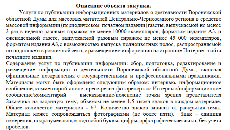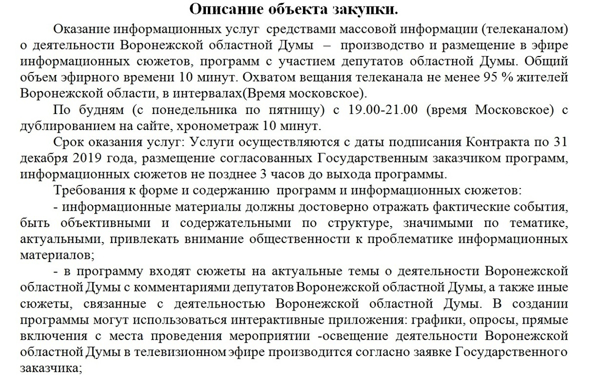 А вот телеканалу с охватом не менее 95% жителей Воронежской области светит контракт чуть скромнее – 724 тысячи рублей. Условия аналогично детально прописаны в документах закупки.