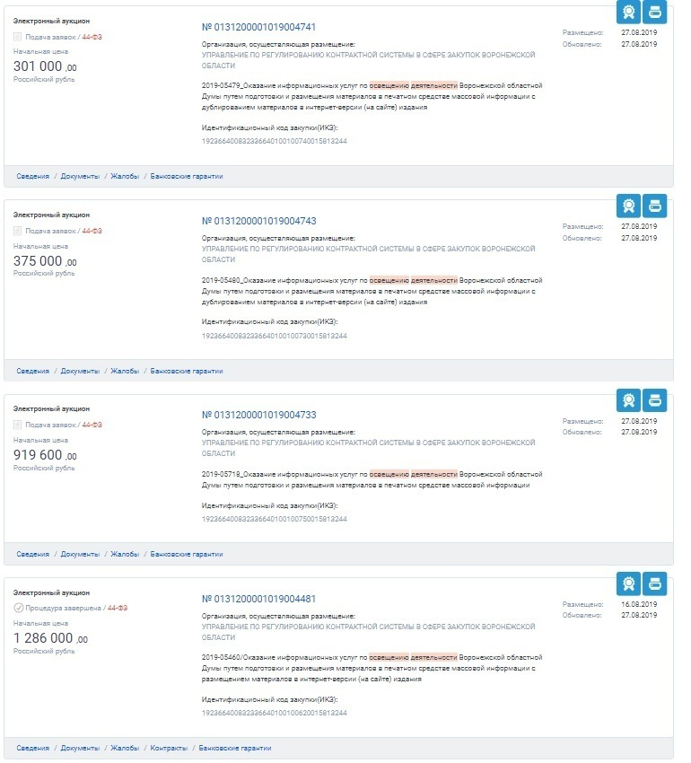 Уже завтра, 6 сентября, состоятся электронные аукционы, на которых определят воронежские СМИ, достойные за солидные суммы денег освещать деятельность депутатов областной Думы. С 16 августа на сайте госзакупок появились 9 контрактов с различными условиями и ценами.