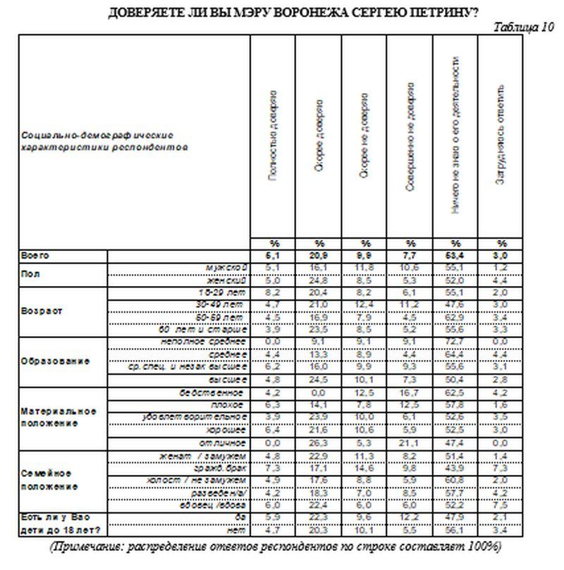 В «Квалитасе» отмечают, что в наибольшей степени доверяют мэру Сергею Петрину предприниматели, служащие муниципальных организаций и предприятий, а также домохозяйки. Не доверяют деятельности градоначальника воронежцы с бедственным материальным положением.