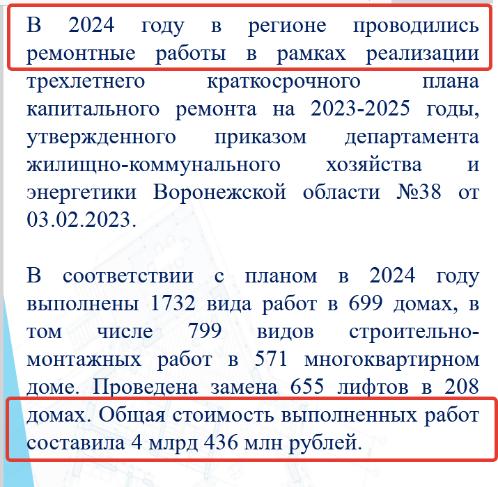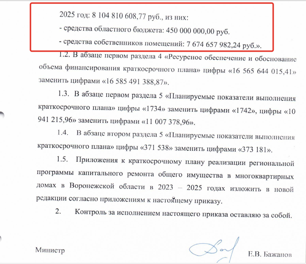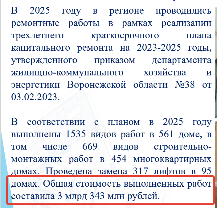 Более того, как ранее сообщал «Блокнот», в министерстве ЖКХ и энергетики Воронежской области в конце декабря прошлого года официально сообщили (приказ №390, от 30.12.2025 г.), что общий объем средств Фонда капремонта МКД в 2025 году составил 8,1 млрд рублей, из которых средства собственников помещений – 7,6 млрд.