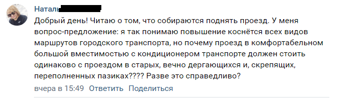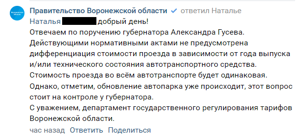 У губернатора Воронежской области Александра Гусева «ВКонтакте» спросили, разве справедливо, что стоимость проезда в старых, вечно дергающихся, скрипящих и переполненных «пазиках» и в комфортабельных автобусах большой вместимости с кондиционерами одинаковая?