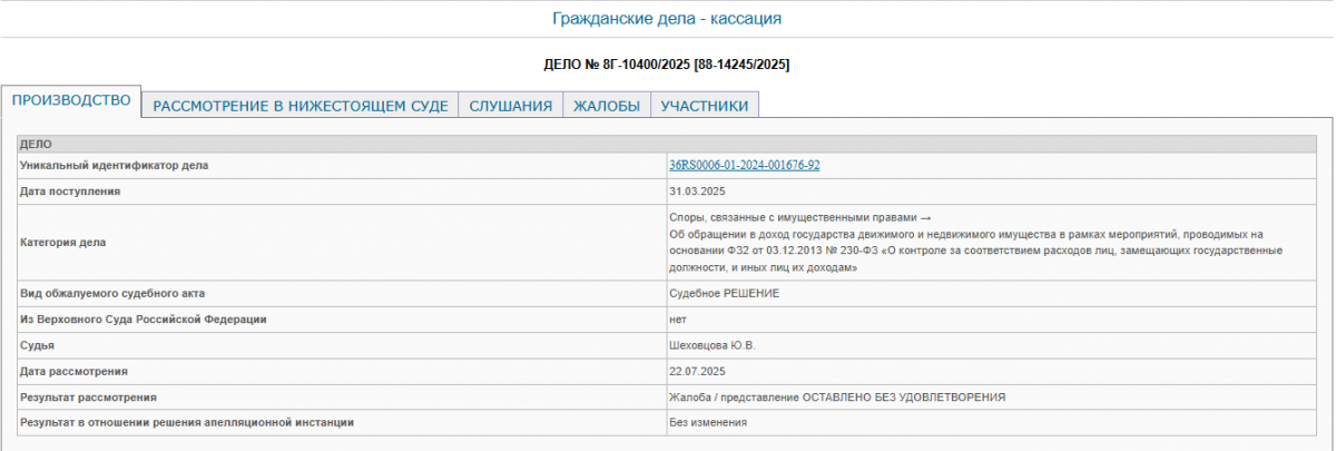 Решение Центрального суда о взыскании средства Плиева пыталась оспорить в Воронежском областном суде, но тогда ничего не вышло, и она обратилась в кассационный суд, но и здесь потерпела поражение.