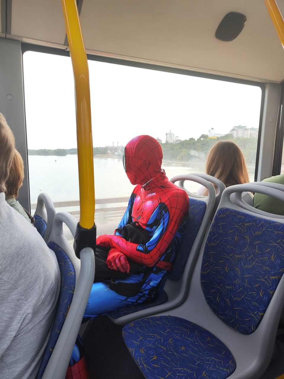 Фото показывает человека в полном красно-синем костюме, который сидит в обычном воронежском транспорте и задумчиво смотрит в окно.