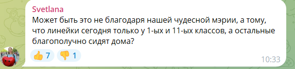 – Может быть, это не благодаря нашей чудесной мэрии, а потому, что линейки сегодня только у первых и одиннадцатых классов? А остальные сидят дома?