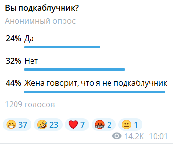 Утвердительно на этот вопрос ответили 24% респондентов. 32% наотрез отказались ассоциировать себя с подкаблучниками. Оставшиеся 44% отшутились.