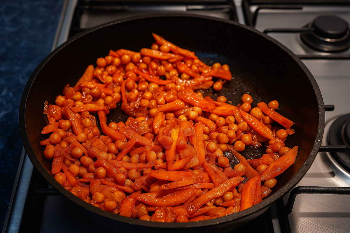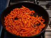 В это время делаем пережарку. Лук нарезаем соломкой и обжариваем его до состояния прозрачности. Затем режем соломкой морковь и обжариваем с луком до золотистого цвета. После этого выкладываем на сковородку консервированный нут, перемешиваем все с томатной пастой. Обжариваем в течение 5-7 минут.