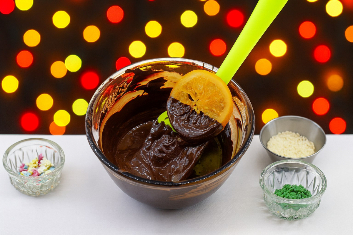 Окуните каждый остывший апельсиновый кружок до половины в растопленный шоколад. Пока глазурь не застыла, украсьте посыпкой или стружкой. Выложите на пергамент до полного застывания шоколада (можно помочь процессу в холодильнике).
