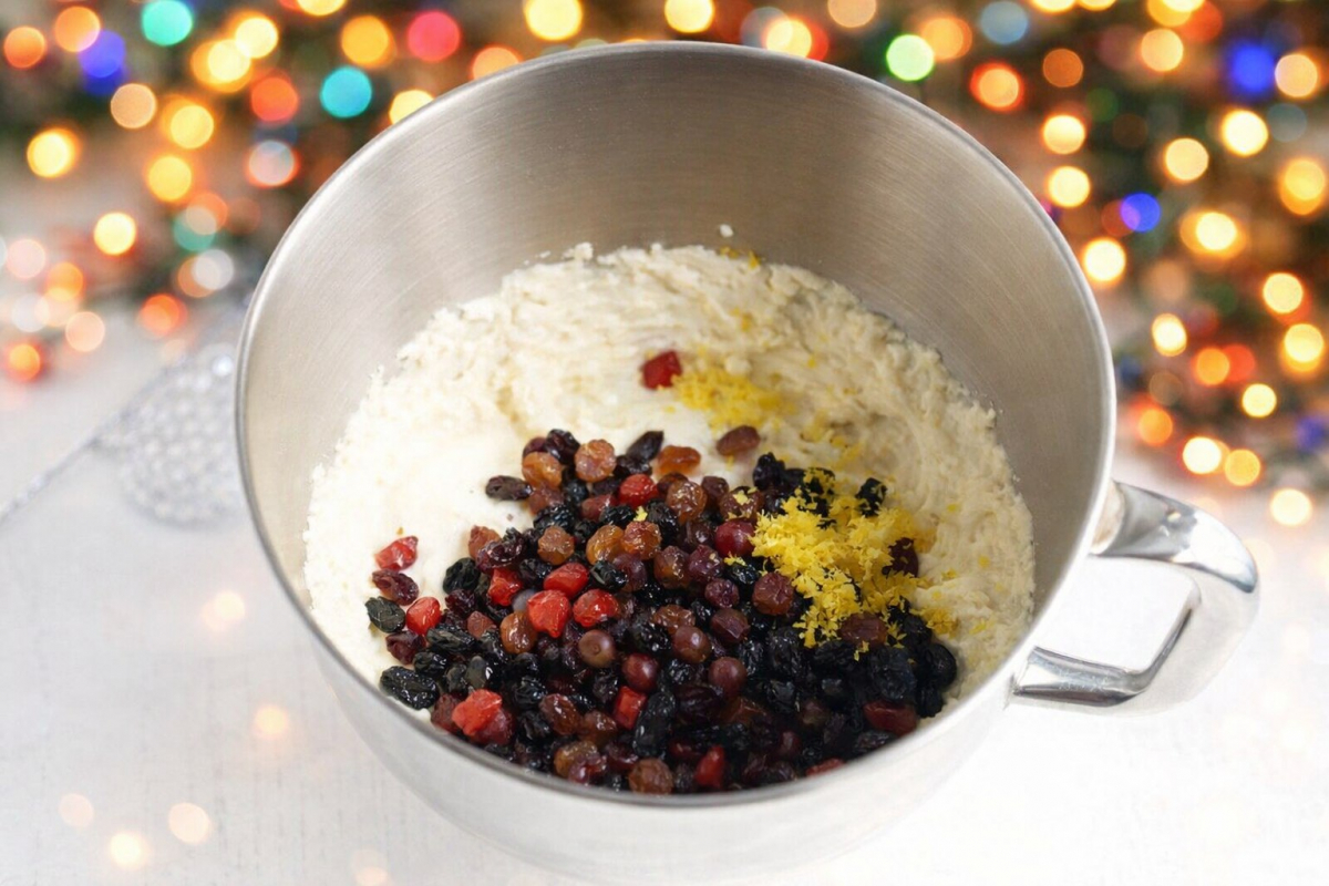 4. Введите подготовленные сухофрукты (без жидкости), цедру лимона и разрыхлитель. Перемешайте лопаткой.