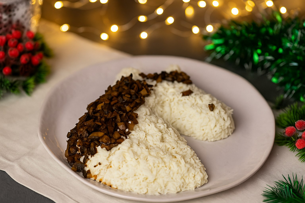 Теперь настало время для творчества! Остывшие жареные шампиньоны будут исполнять роль темных деталей. Выложите их так, чтобы получилась грива, ухо, выразительный глаз и ноздря. Дайте салату немного пропитаться в холодильнике в течение 30–60 минут.
