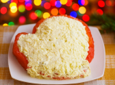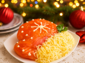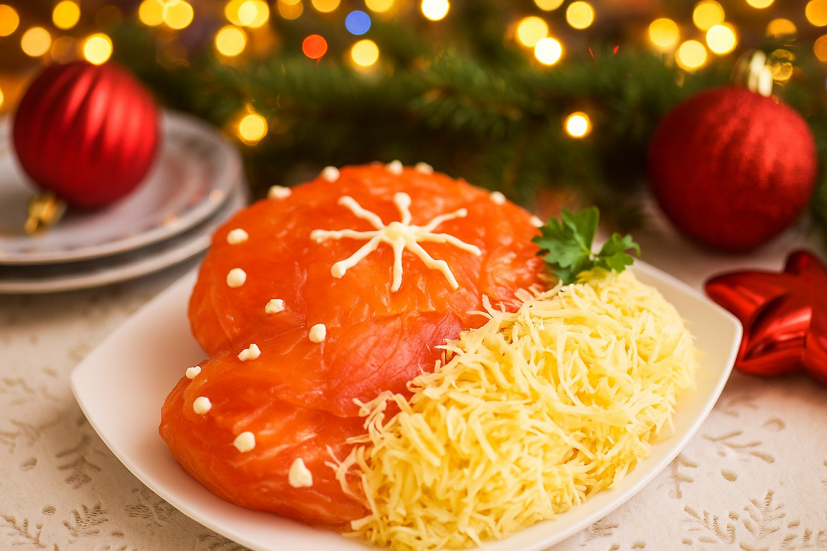 5. Пришло время дизайнерских решений: тонкими ломтиками рыбы оформите края и верх салата, посыпьте оставшимся сыром. Дальше — полная свобода творчества. Можно выложить снежинку, сделать «узор» из майонеза или добавить капельки-«звёздочки».