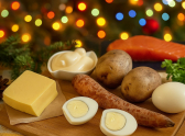 1. Подготовьте все ингредиенты: отварите в мундире картофель и морковь, остудите, очистите и натрите их на крупной тёрке. Яйца сварите вкрутую, охладите, разделите белки и желтки и натрите их отдельно.