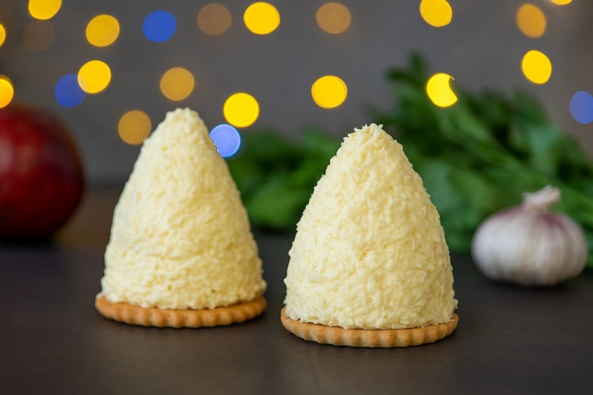 Разложите круглые крекеры на рабочей поверхности. Чайной ложкой или руками выложите на каждый крекер порцию сырной массы, сформировав аккуратную горку. Затем влажными пальцами аккуратно придайте этой горке форму конуса — это и будет основа нашей будущей ёлочки. Старайтесь, чтобы основание конуса лежало на крекере, а макушка была острой.