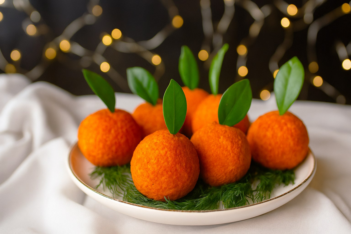Эти симпатичные и вкусные шарики, внешне напоминающие сочные мандарины, станут настоящим украшением вашего праздничного стола.