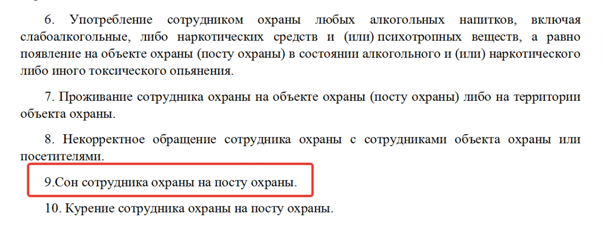 Не пить, не курить, не употреблять наркотики и не спать на рабочем месте – таковы одни из основных требований к сотрудникам охраны здания Воронежской областной Думы. Кроме того, защитникам депутатов запрещается находиться на посту без специальной форменной одежды, которая должна быть чистой и аккуратной. Также сотрудникам охраны здания парламентского центра, по ул. Кирова, 2, запрещается проживание на территории объекта, то есть в здании Воронежской облдумы, а еще грубить и некорректно общаться с сотрудниками и посетителями.