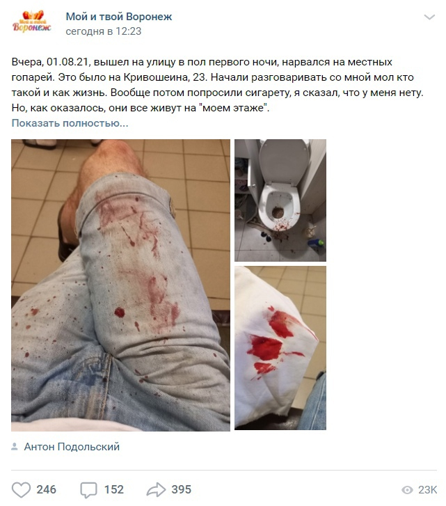 Местного жителя жестоко избили прямо в собственной квартире на улице Кривошеина, 23. Все едва не обернулось трагедией. Пострадавший рассказал о случившемся в городском сообществе ВК «Мой и твой Воронеж» 2 августа.