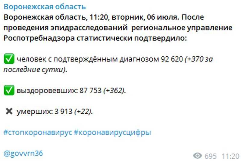 Утром 6 июля оперативный штаб по борьбе с распространением Covid-19 в Воронежской области сообщил актуальную статистику по заболеваемости этой заразой. Оказалось, что за минувшие сутки коронавирус подхватили 370 человек. Днем ранее аналогичный показатель был на уровне 262 заражений. Соответственно, в регионе продолжился рост заболеваемости Covid-19. Теперь, с учетом новых цифр, с начала пандемии коронавирус в Воронежской области подхватили уже 92 тыс 620 человек.