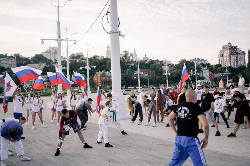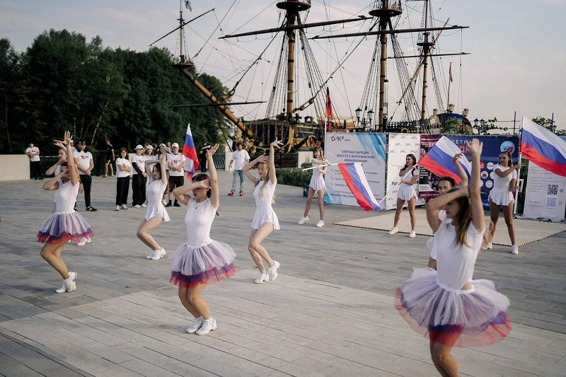 Энергией танцев и красотой триколора воронежцев зарядила Группа поддержки «Пламенные» с развевающимися флагами. А гимнастка Диана Холжигитова стала воплощением грации и продемонстрировала своё спортивное мастерство. Не отставал в этот день и клуб спортивных бальных танцев «Виват».