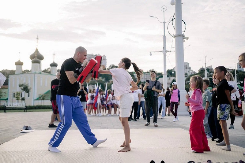 Над площадью торжественно подняли флаги России и началась основная программа – выступления спортивных коллективов. Среди них - лауреаты различных турниров, чемпионатов, конкурсов, тренера и воспитанники воронежских спортклубов.